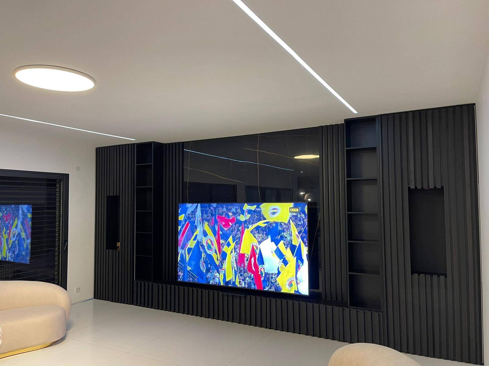Donnez une nouvelle dimension à votre salon, en optons pour la réalisation de meuble sur mesure pour habiller votre mur de la télévision du salon, tout en optimisant les espaces, avec différentes niches dissimulées et ouvertes pour vos éléments décoratifs, agrémenté d'une porte invisible pour l'esthétique et le fonctionnel. Sur cette photo, notre réalisation sur mesure de nos meubles de salon pour notre client sur Marseille.